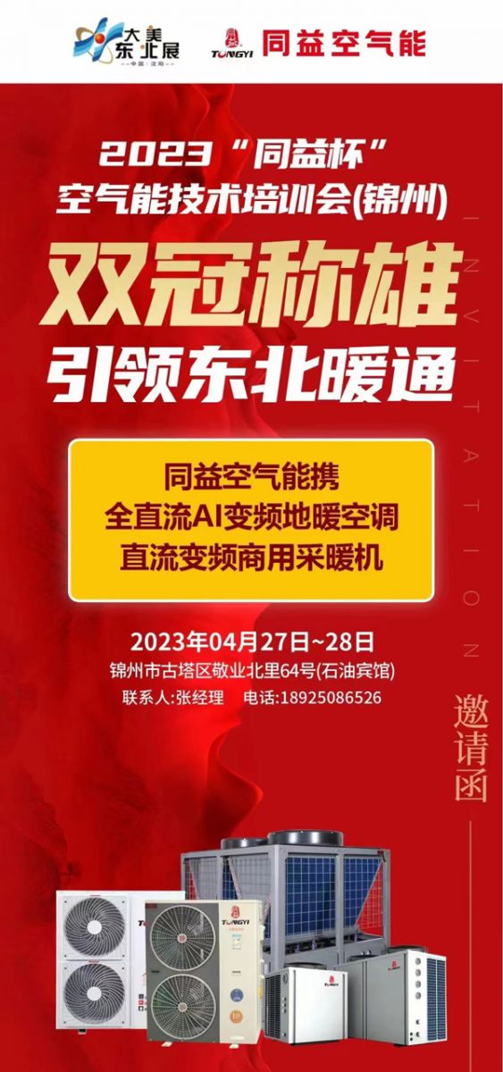 2023“同益杯”空氣能技術(shù)培訓(xùn)會將于4月27日-28日在錦州市古塔區(qū)錦州石油賓館隆重啟幕!本次培訓(xùn)會由同益空氣能獨家冠名,匯聚東北各地經(jīng)銷商齊聚錦州,共謀東北暖通行業(yè)千億市場!